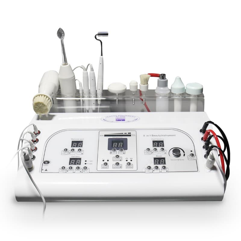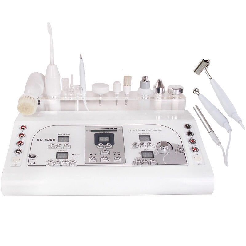 Косметологический комбайн RU-8208, который сочетает в себе следующие функции: брашшинг, гальваника, вакуумный спрей, ультразвуковая терапия, коагулятор, дарсонваль.